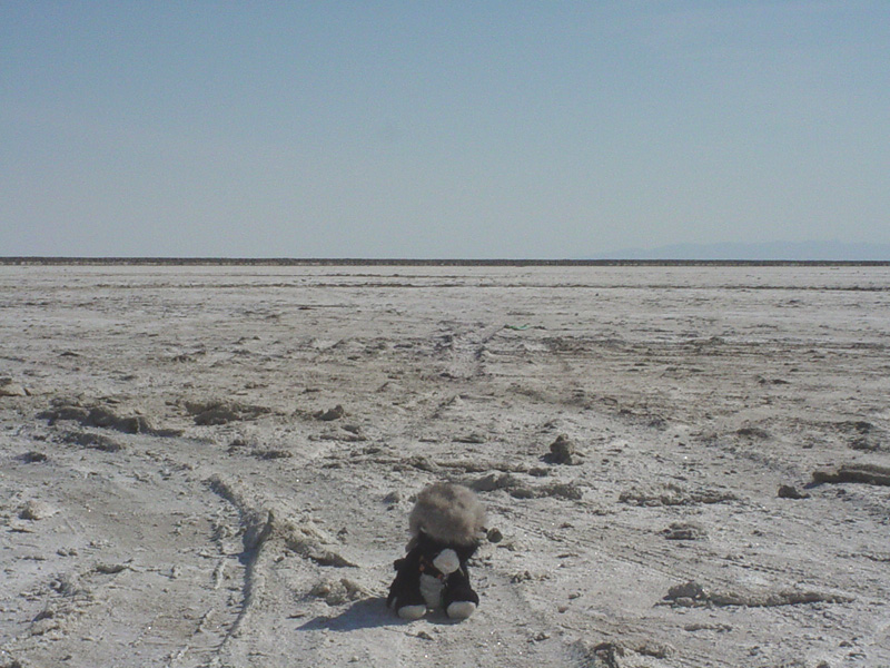 Kitty sits in the desolate salt flats. Boy it's hot! |