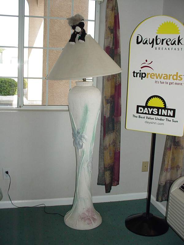 Kitty perches atop an example of bad hotel decor. |
